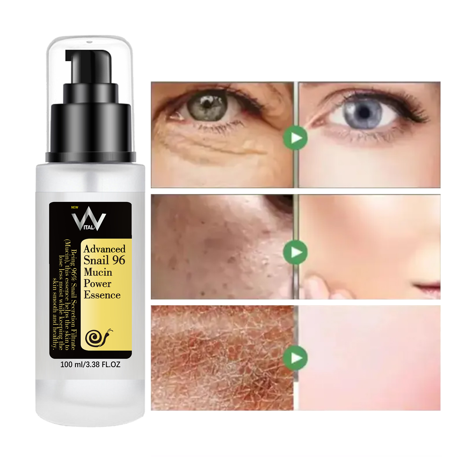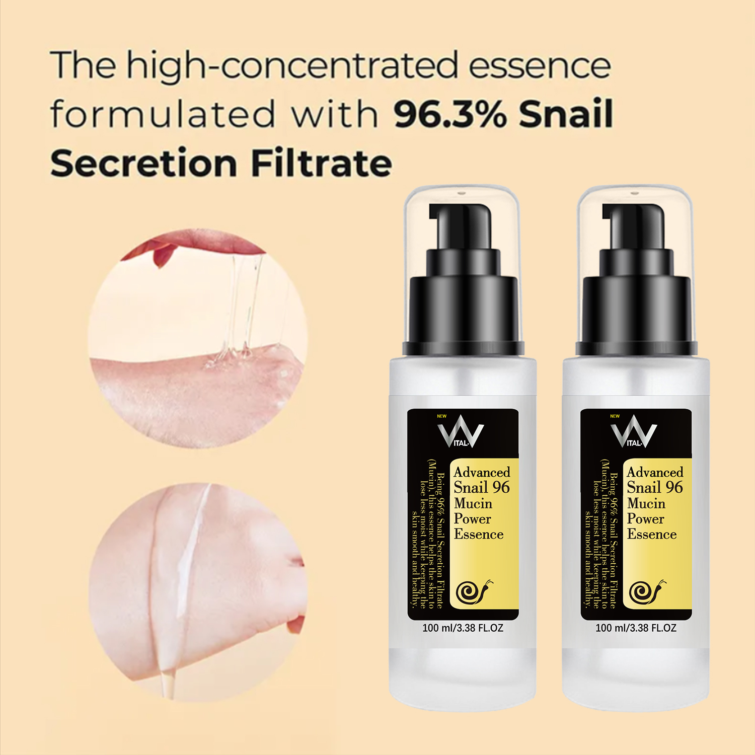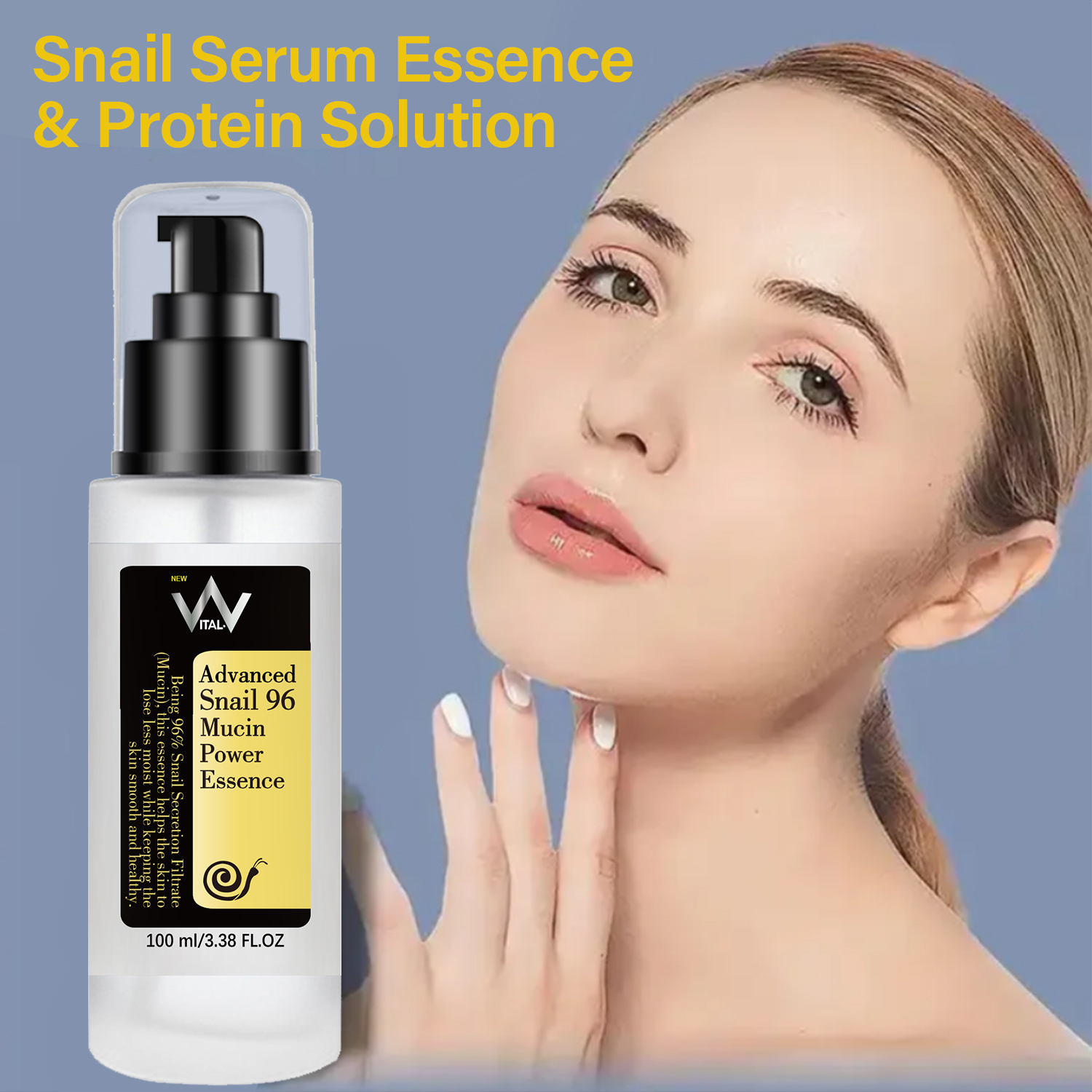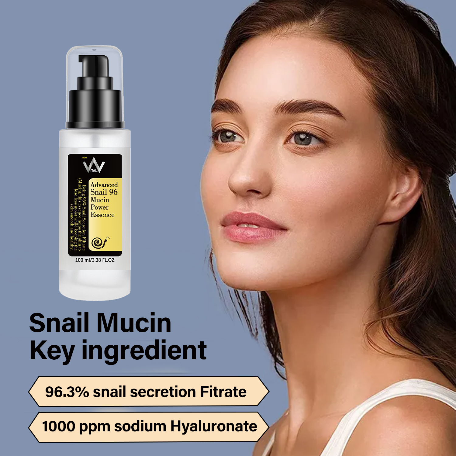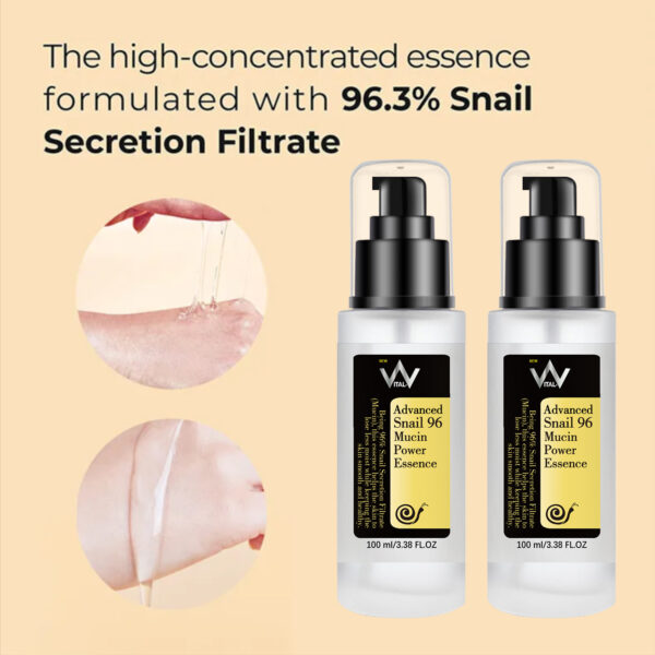 Vital-V Advanced Snail 96% Mucin Power Essence is a concentrated, hydrating essence infused with 96% snail mucin. This powerful ingredient helps to lock in moisture, soothe and calm irritated skin, and promote collagen production for a more radiant and youthful complexion. # Key Ingredients: – 96% Snail Mucin: Hydrates and nourishes the skin – Hyaluronic Acid: Attracts and retains moisture – Glycoproteins: Stimulates collagen production and improves skin elasticity # Benefits: – Intensely hydrates and nourishes dry, dehydrated skin – Soothes and calms irritated skin – Promotes collagen production for improved skin elasticity – Evens out skin tone and texture for a brighter, more radiant complexion # How to Use: 1. After cleansing and toning, apply a few drops to the face and neck. 2. Gently pat into the skin until fully absorbed. 3. Follow up with your usual moisturizer and sunscreen. # Product Details: – Size: 3.38 fl.oz / 100mL – Suitable for all skin types, including sensitive skin – Cruelty-free and vegan-friendly